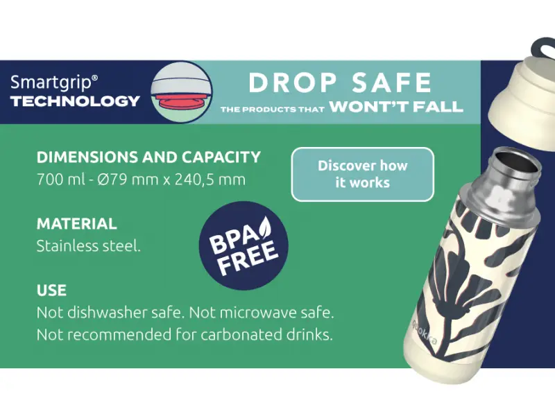 Quokka Pulse je súčasťou kolekcie fliaš a hrnčekov Drop Safe so špeciálnym dnom Smartgrip®, ktoré pri postavení na hladký povrch bránia prevrhnutiu a nechcenému vyliatiu obsahu fľaše.