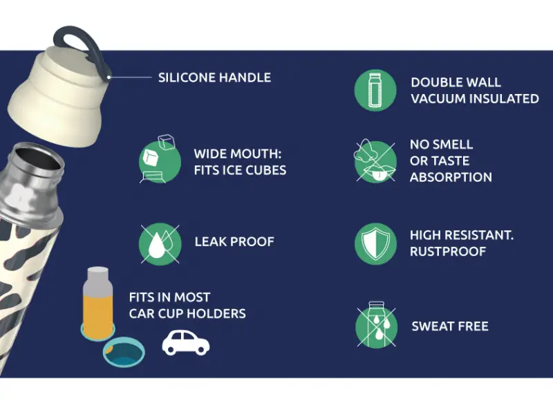 Termoska Quokka Pulse z vysoko kvalitnej dvojstennej ocele so spoľahlivým, 100% tesniacim uzáverom udrží váš nápoj podľa potreby teplý alebo studený. Široké hrdlo umožňuje vloženie kociek ľadu. Termoska udrží teplotu studeného nápoja s ľadom až 48 hodín, studeného nápoja až 16 hodín a teplého nápoja až 12 hodín. Silikónové pútko, ktoré je zakomponované do viečka fľaše, uľahčuje prenášanie.