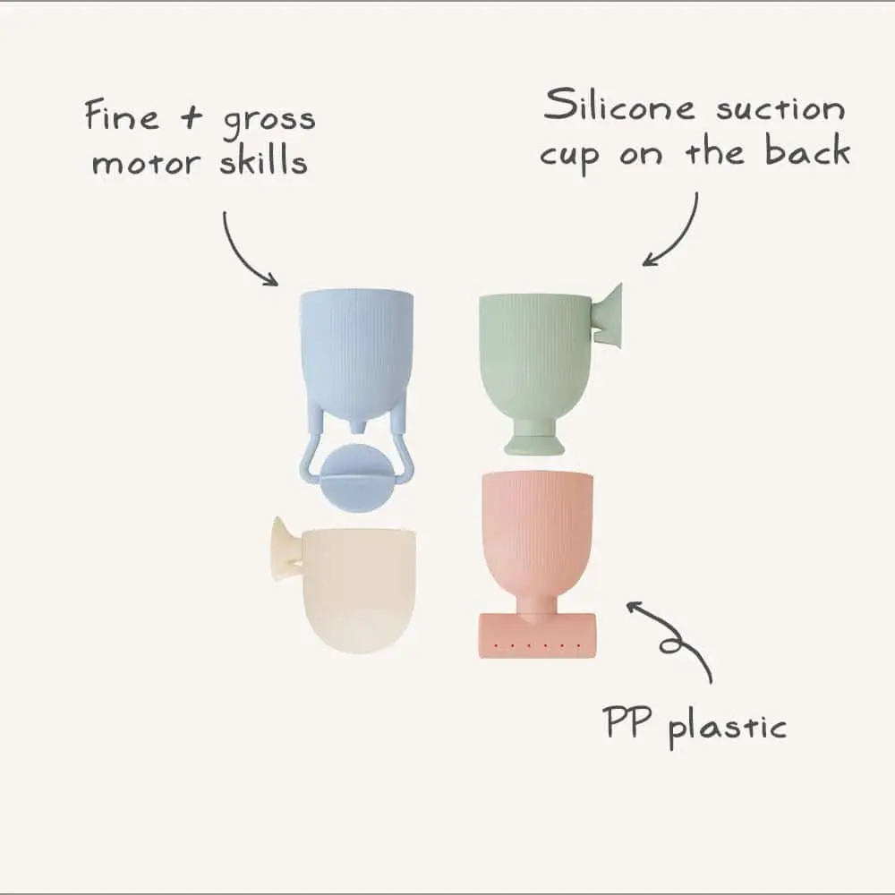 Každý pohárik je vybavený silikónovou prísavkou, vďaka ktorej ho deti môžu pripevniť na stenu vane a vytvárať vlastné vodopády. Rôzne otvory na spodnej strane umožňujú prúdenie vody v odlišných vzoroch, čo ešte viac stimuluje detskú predstavivosť. Priložený pohárik na nalievanie rozširuje možnosti hry a podporuje rozvoj koordinácie ruka-oko.