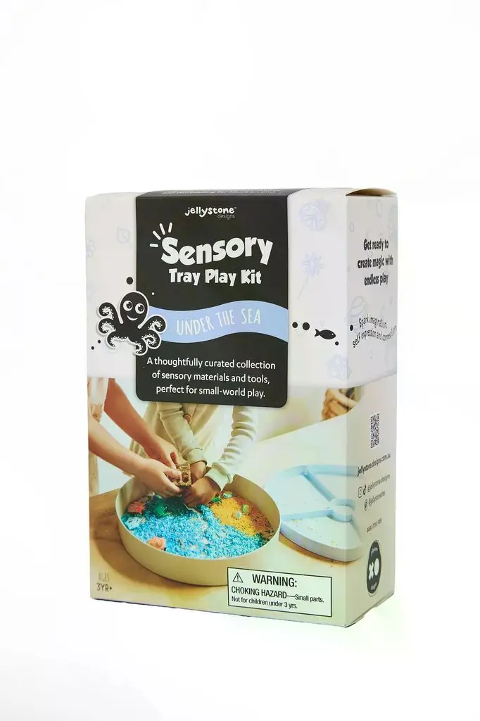 Senzorický set Morský svet značky Jellystone Designs pozýva deti k tichému objavovaniu, presýpaniu, triedeniu a vytváraniu vlastných príbehov z hlbín oceánu. Zmyslové hranie inšpirované vodným prostredím prirodzene podporuje upokojenie, sústredenie a vnútornú rovnováhu.