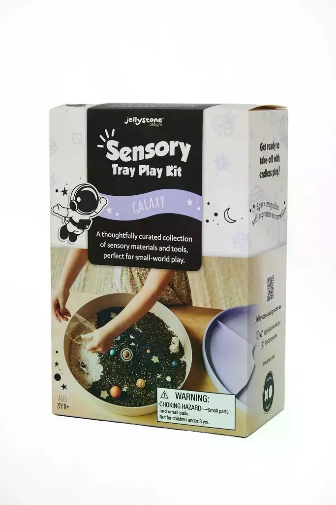Senzorický set Vesmír značky Jellystone Designs je hravá tematická sada navrhnutá pre otvorenú hru a hlbšie sústredenie. Deťom ponúka priestor na samostatné objavovanie, triedenie, presýpanie, vytváranie scenárov a rozvoj fantázie v bezpečnom a štruktúrovanom prostredí.