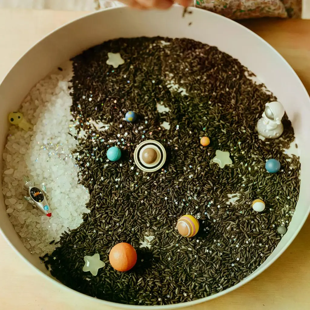 Set je ideálnym doplnkom k senzorickému tácu Play Tray, ktorý pomáha vymedziť pracovný priestor a podporuje princíp „pripraveného prostredia“, typického pre Montessori prístup. Deti môžu vytvoriť vlastnú vesmírnu krajinu, stavať planéty, vysielať raketu do priestoru alebo objavovať nové galaxie. Každý prvok podporuje voľnú hru bez pevne daných pravidiel – dieťa si samo určuje, čo sa bude diať.