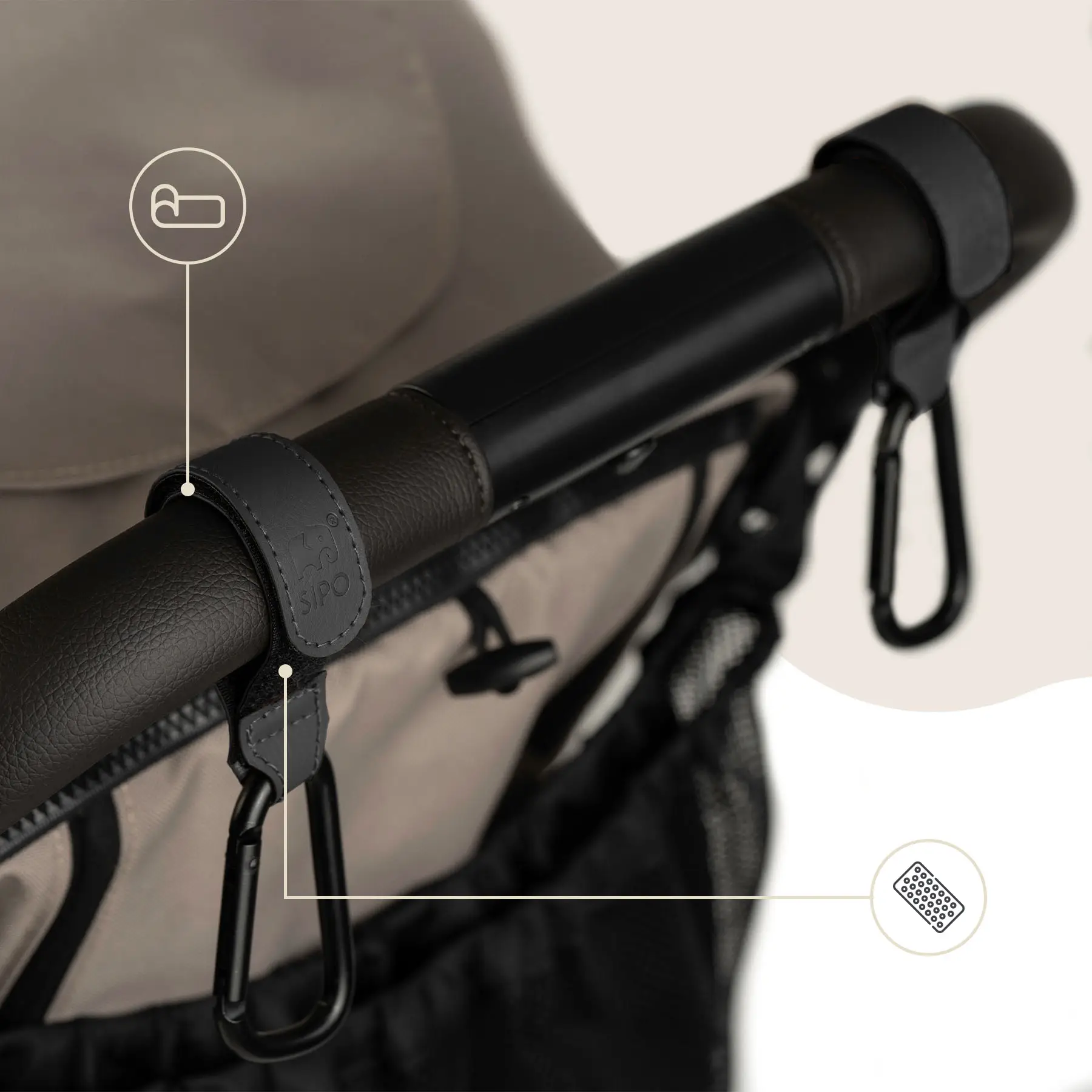 Háčiky na kočík SIPO sú praktickým doplnkom, ktorý uľahčuje prenášanie tašiek, nákupu alebo organizéru pre deti. Robustná konštrukcia pozostáva z matnej kovovej karabíny a PU koženého remienka, ktorý zaisťuje odolnosť a stabilitu aj pri každodennom používaní. Vďaka univerzálnemu dizajnu a elegantnému vzhľadu sú háčiky kompatibilné so všetkými typmi kočíkov – so športovými aj s hlbokými.