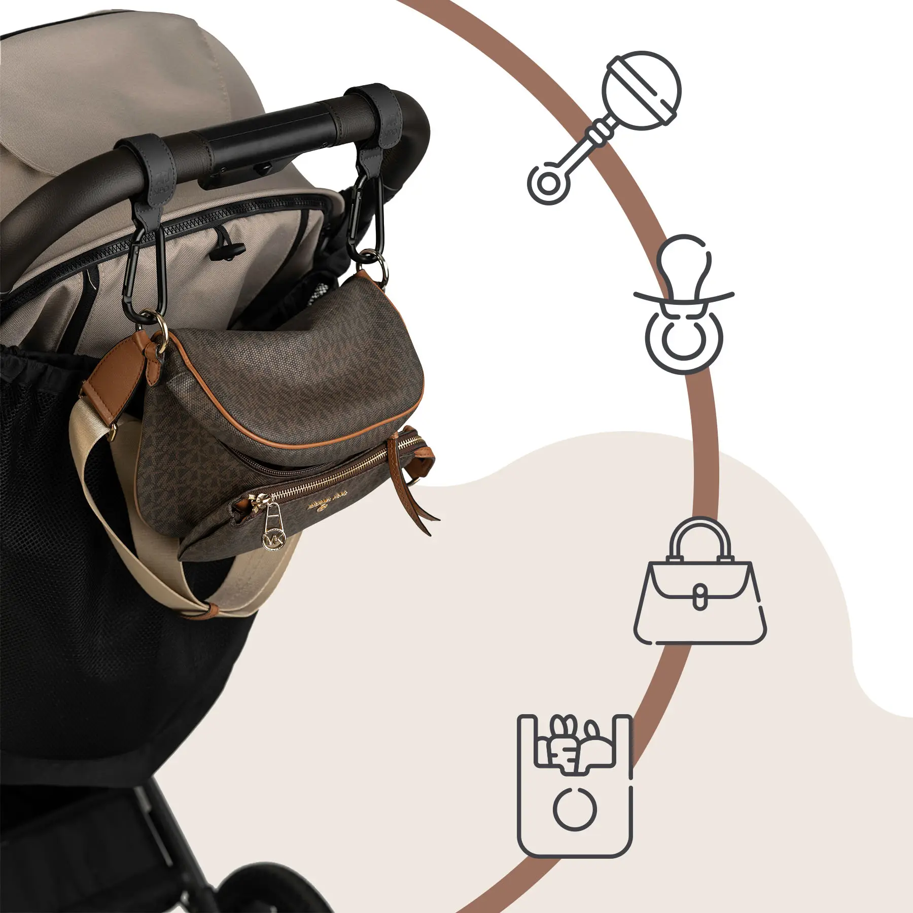 Obtočte PU kožený remienok okolo rukoväte kočíka (alebo iného úchytu), zaistite ho silným suchým zipsom a následne pripnite tašku, sieťku alebo inú batožinu ku kovovej karabíne (háčiku). Vďaka ľahkej konštrukcii a jednoduchému mechanizmu je pripevnenie a vybratie predmetov rýchle a pohodlné – aj keď držíte dieťa.