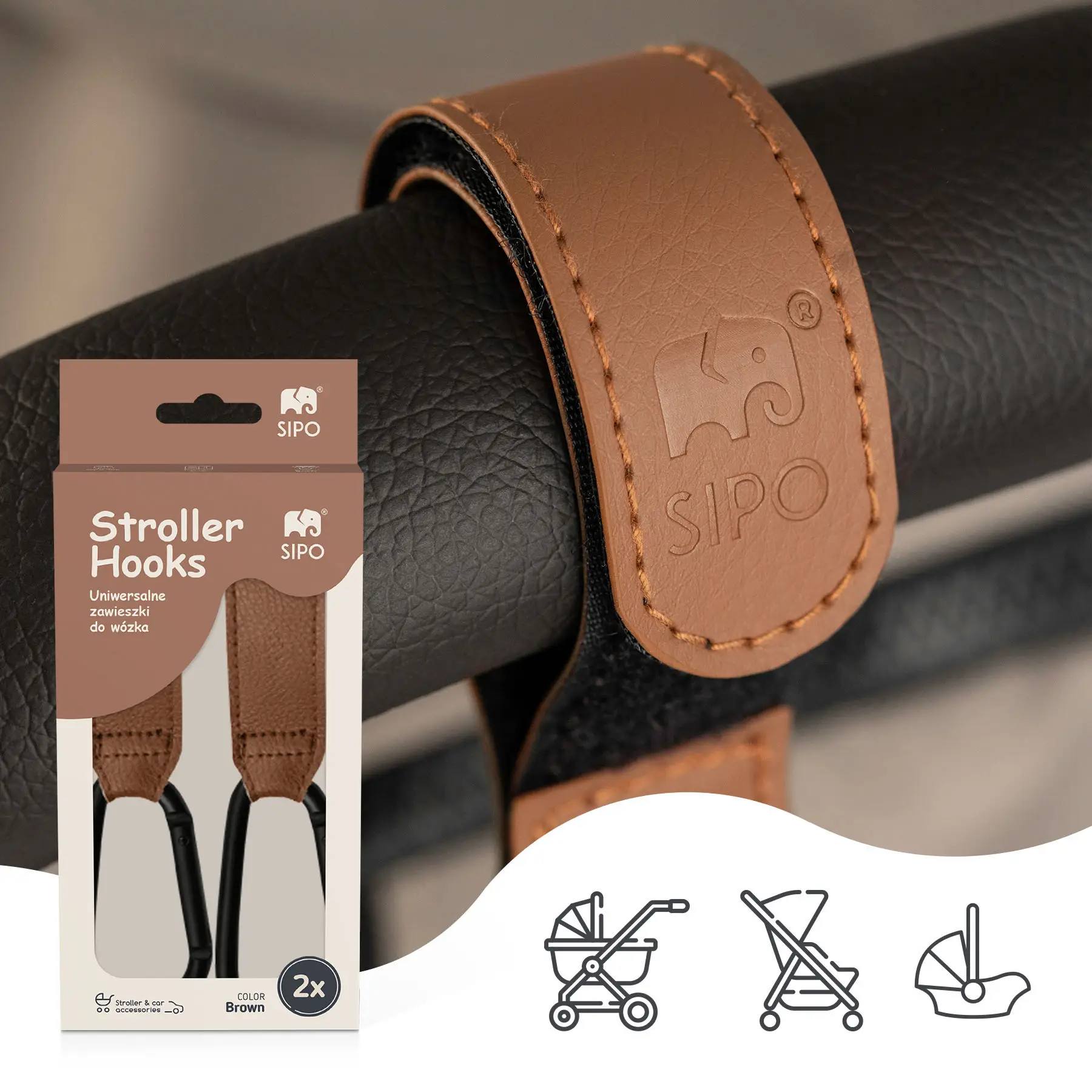 Háčiky na kočík SIPO sú praktickým doplnkom, ktorý uľahčuje prenášanie tašiek, nákupu alebo organizéru pre deti. Robustná konštrukcia pozostáva z matnej kovovej karabíny a PU koženého remienka, ktorý zaisťuje odolnosť a stabilitu aj pri každodennom používaní. Vďaka univerzálnemu dizajnu a elegantnému vzhľadu sú háčiky kompatibilné so všetkými typmi kočíkov – so športovými aj s hlbokými.