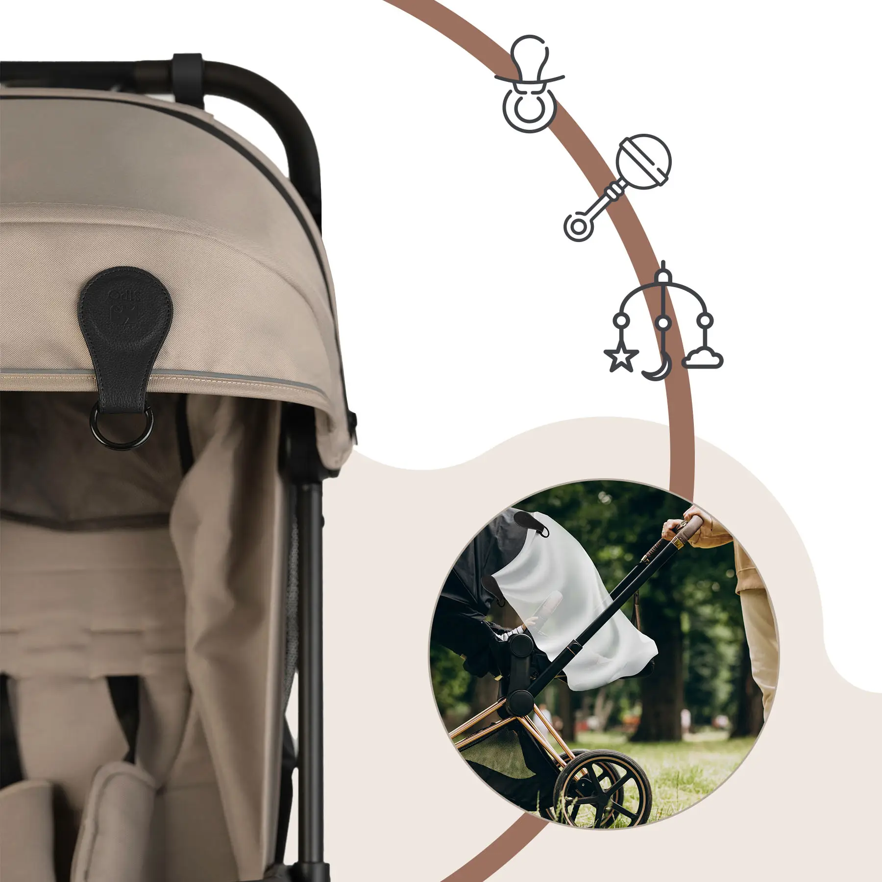 Odporúča sa iba na použitie s ľahkými, priedušnými látkami, ktoré neobmedzujú prúdenie vzduchu okolo dieťaťa – ako je bavlna, mušelín alebo sieťovina. Úplné zakrytie kočíka vzduchotesnými materiálmi môže spôsobiť prehriatie a neodporúča sa. Ak sú spony znečistené, je možné ich utrieť vlhkou handričkou – nepoužívajte agresívne čistiace prostriedky. Nie je vhodné na pranie v práčke ani umývanie v umývačke riadu.