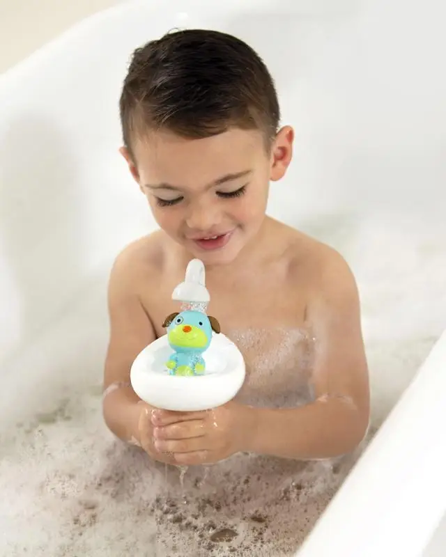 Zábavná hračka do vody. Motivujte dieťatko do kúpeľa prostredníctvom malého psíka, ktorého treba tiež umyť. Stlačením balónika pod vodou dieťa vytlačí vodu, ktorá sa spustí cez sprchovú hlavicu a umyje psíka. Psík je odnímateľný a pláva vo vode.