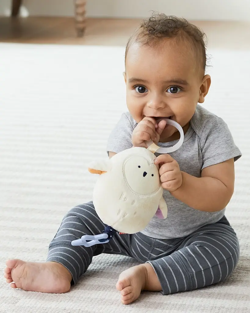Ste pripravení na mäkký plyšový dotyk sovičky? Keď zatiahnete za hviezdičku, táto mäkučká sovička začne vibrovať a triasť sa, čím upúta pozornosť dieťatka. Vďaka C krúžku je možné hračku pripojiť na kočík alebo autosedačku a zobrať si ju na cesty.