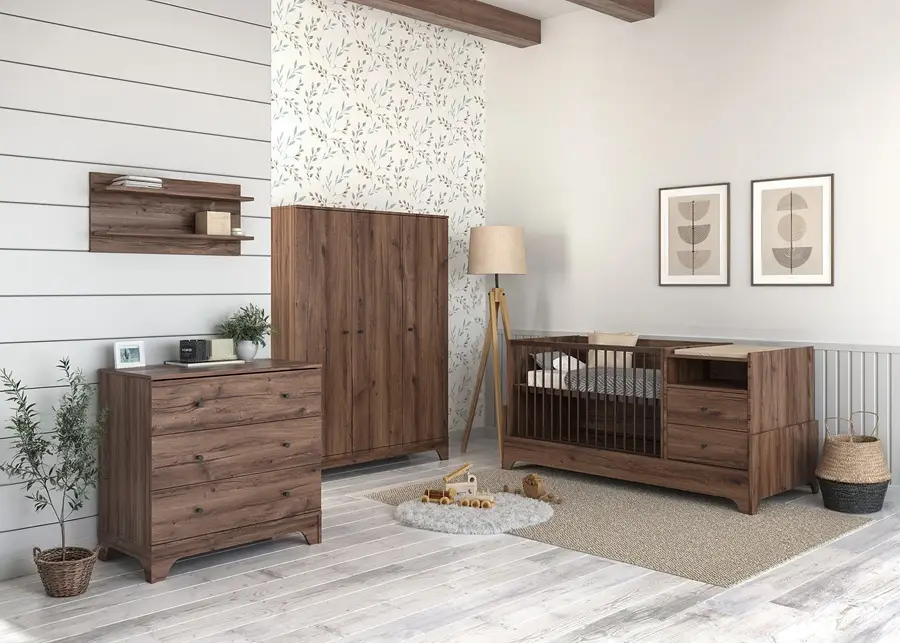 Priestranná 3 dielna šatníková skriňa do detskej izby Nest Walnut pojme všetko oblečenie aj iné drobné potreby pre dieťa po dlhú dobu.