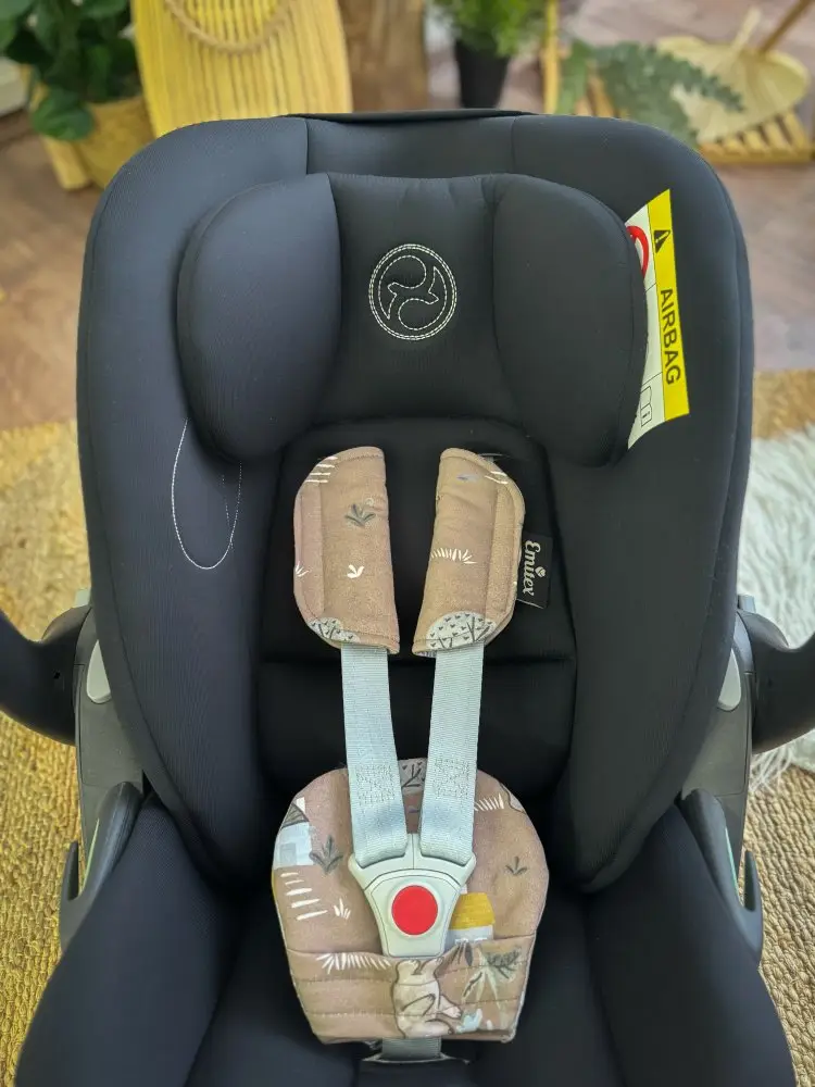 Vhodné na použitie v kočíku aj v autosedačke. Ramenné polstrovanie má suché zipsy pre rýchle nasadenie, väčšie polstrovanie sa navlieka na sponu autosedačky.