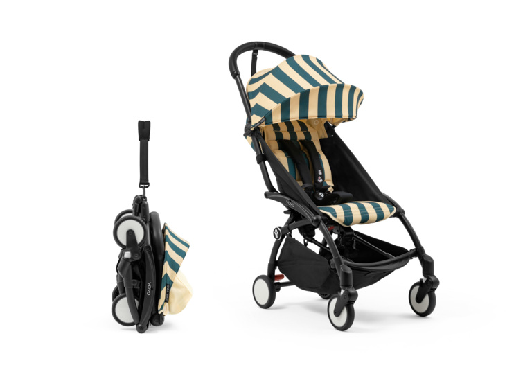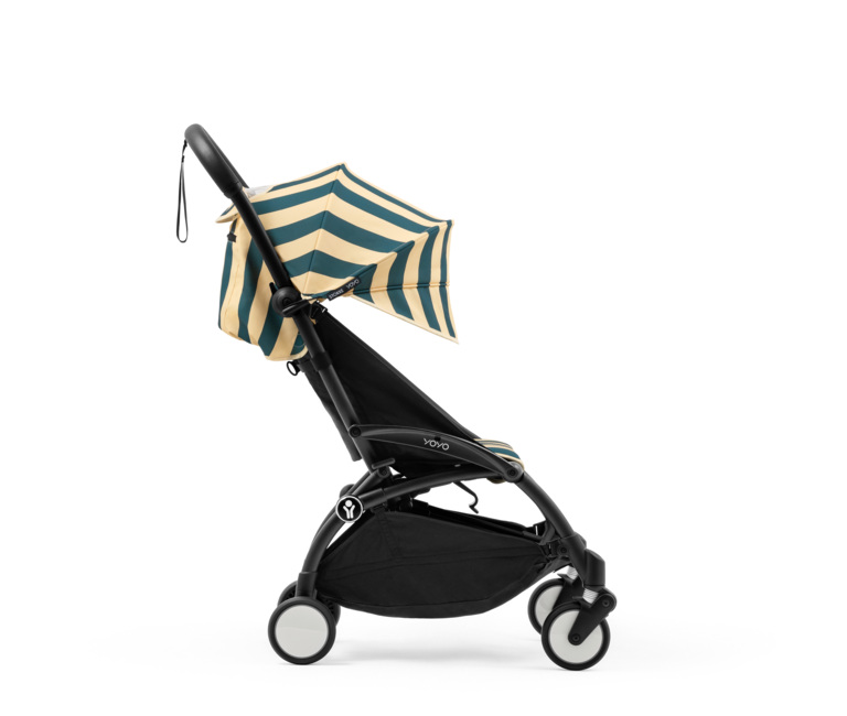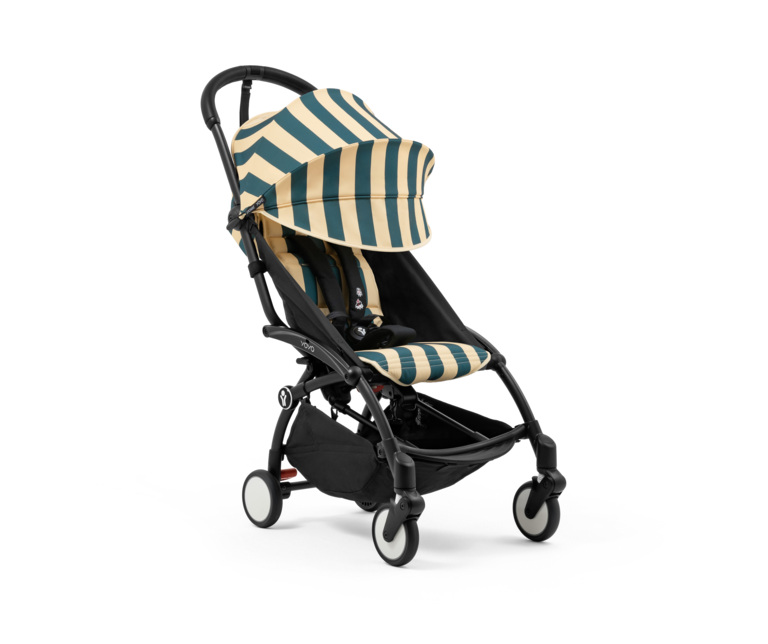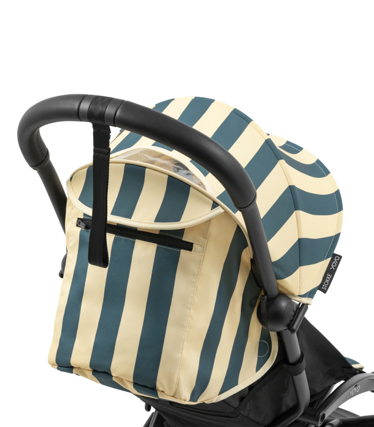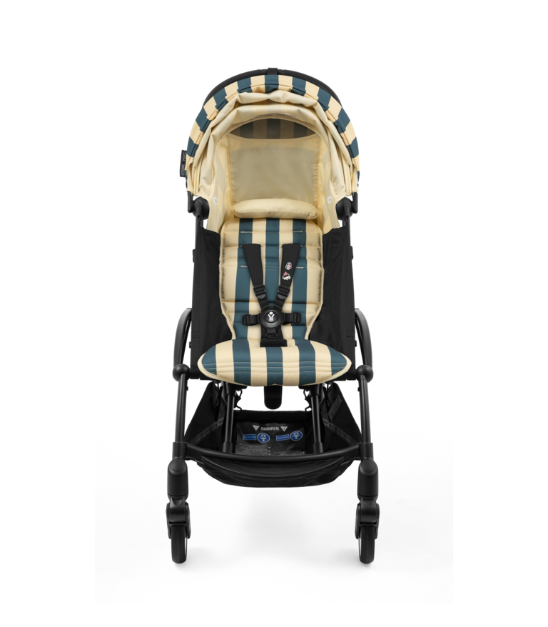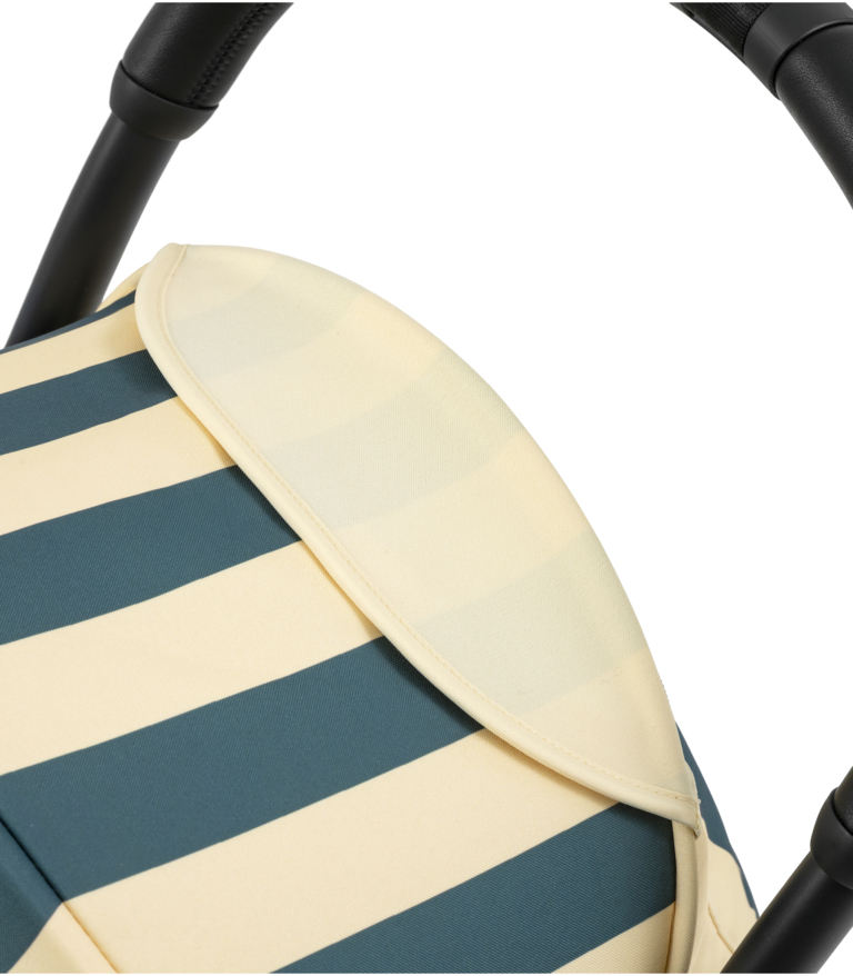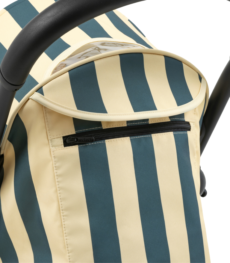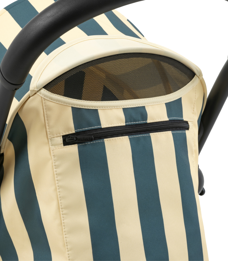 Color Pack 6+: Ikonické sedadlo a strieška YOYO textílie s novým žiarivým vzorom Monaco – sýta, tmavomodrá farba, s jemnými krémovými pruhmi