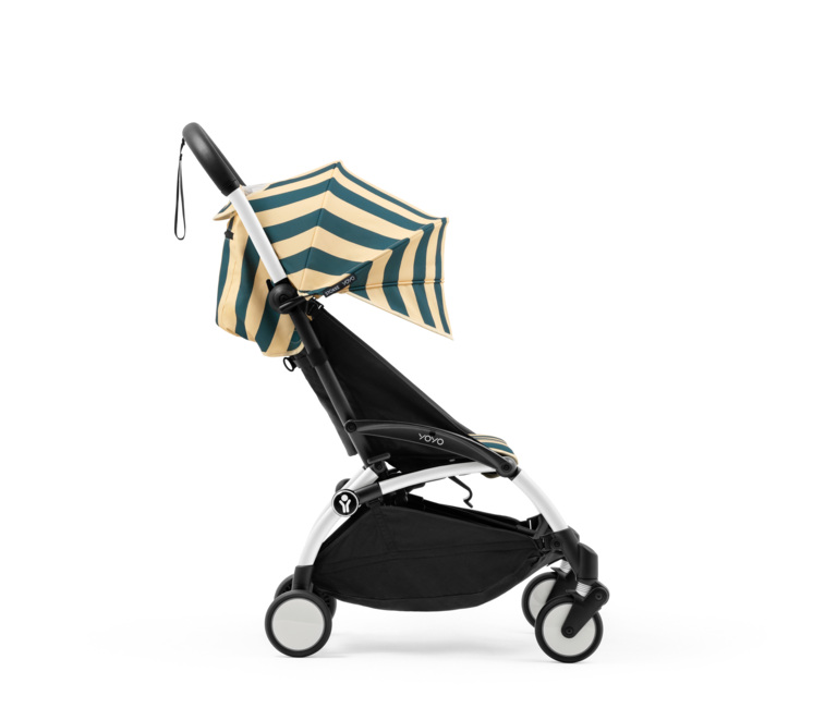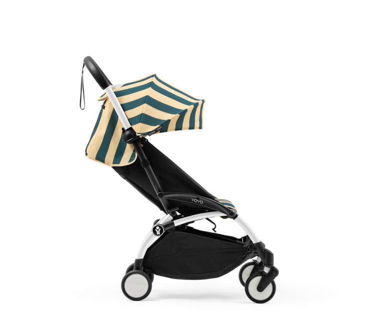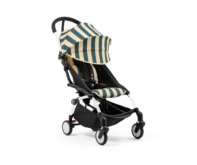 Color Pack 6+: Ikonické sedadlo a strieška YOYO textílie s novým žiarivým vzorom Monaco – sýta, tmavomodrá farba, s jemnými krémovými pruhmi
