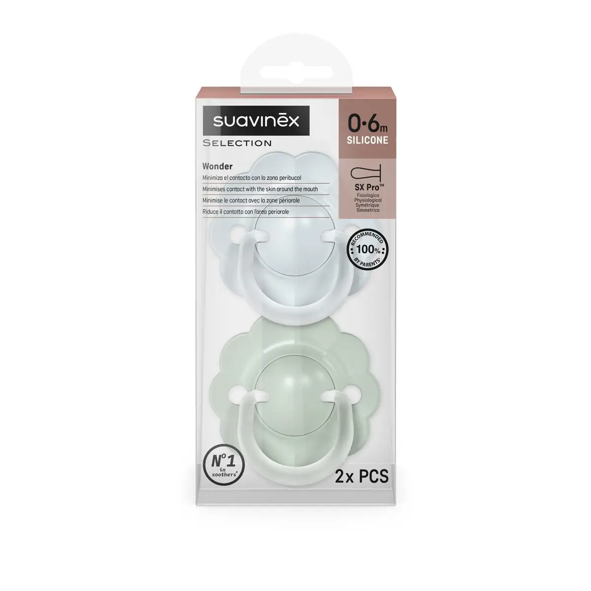 Dudlíky Wonderland sú vybavené fyziologickou cumlíkovou časťou SX Pro zo silikónu, ktorá rešpektuje prirodzený vývoj ústnej dutiny dieťaťa. Vďaka plochému a symetrickému tvaru sa vždy správne prispôsobí v ústach.
