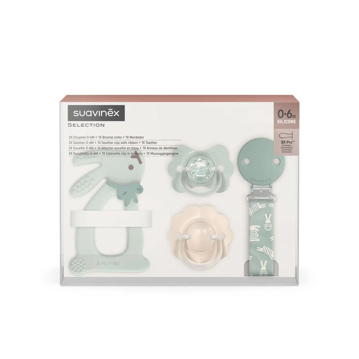 Fyziologická savička SX Pro bola navrhnutá tak, aby rešpektovala vývoj ústnej dutiny a chrupu bábätka. Je vyrobená z tenkého, ultra jemného silikónu s jemne matným (pieskovaným) povrchom, ktorý napodobňuje textúru a konzistenciu materskej bradavky, čím zabezpečuje: maximálnu prirodzenosť, mimoriadnu pružnosť a prispôsobenie sa tvaru podnebia.