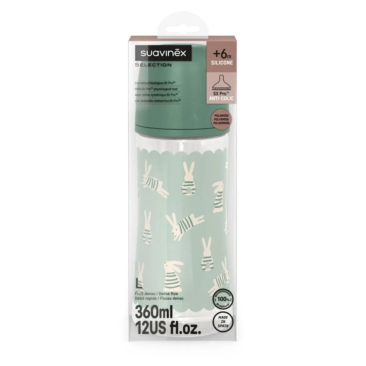 SUAVINEX Dojčenská fľaša WONDERLAND NEW 360ml FYZIOL PRIETOK L - zelený králik