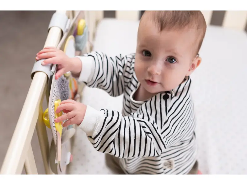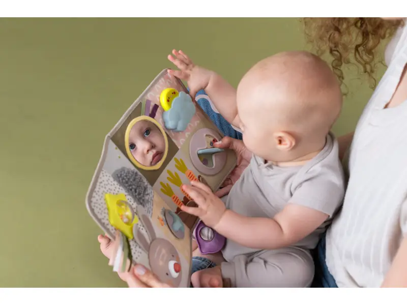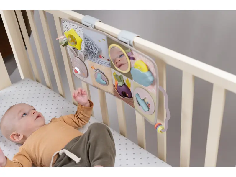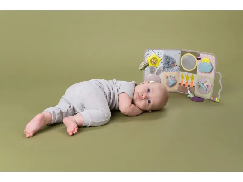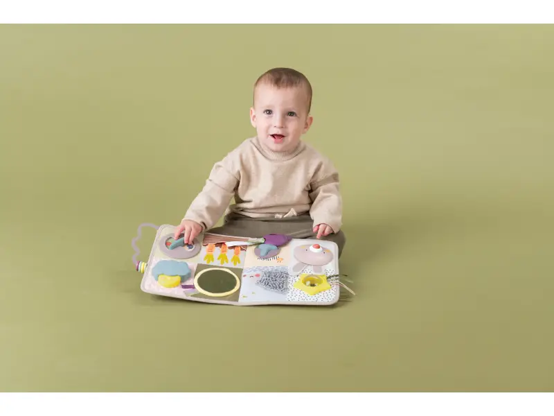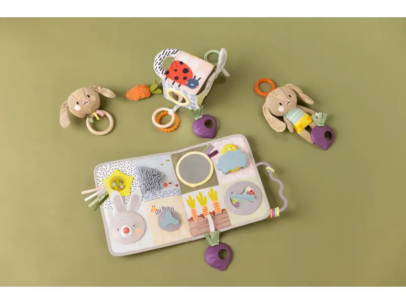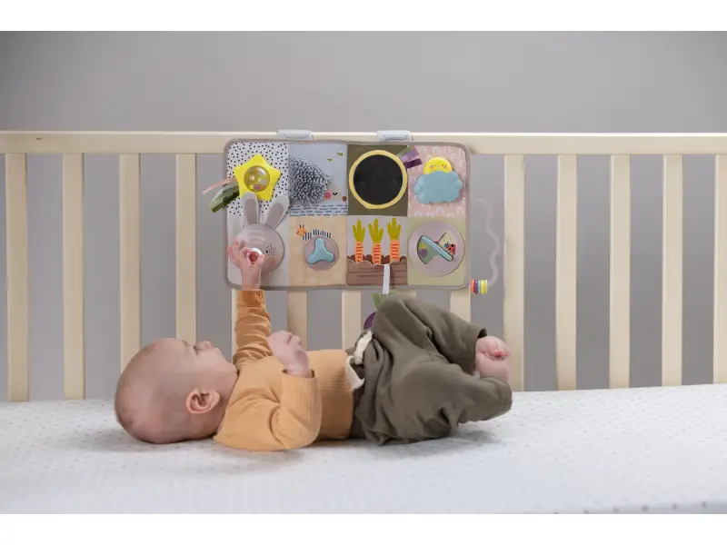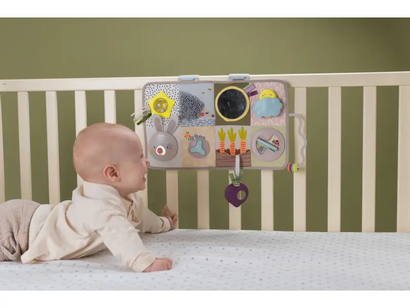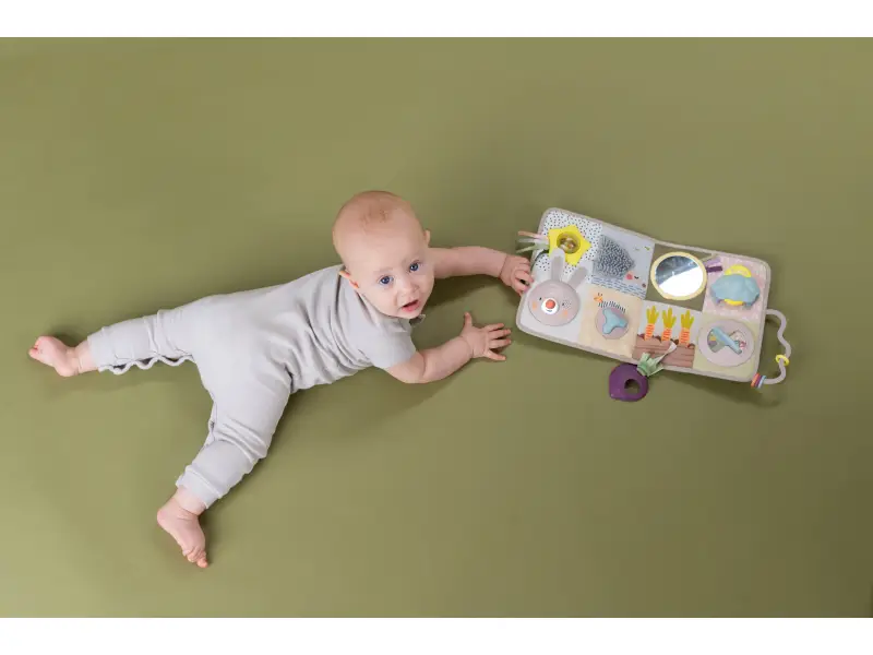 Na hracom pulte nájdete zajačika s hudbou a svetielkami, schovávacie hry, hrkajúcu priehľadnú loptičku s korálkami, šuštiace časti, hryzátka, pohyblivé krúžky, otočné kolieska a ďalšie aktivity a textúry na skúmanie.