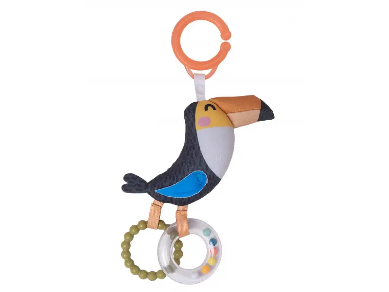 Závesná hračka v podobe tukana Tukiho pri pohybe hrká. Súčasťou hračky je priehľadný hrkajúci krúžok s korálkami a krúžok slúžiaci ako hryzátko.