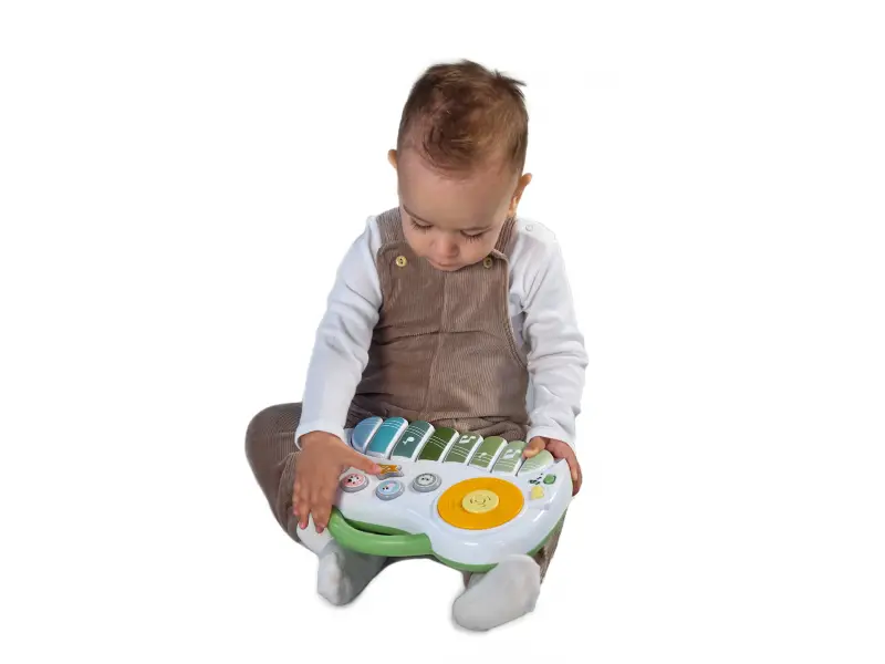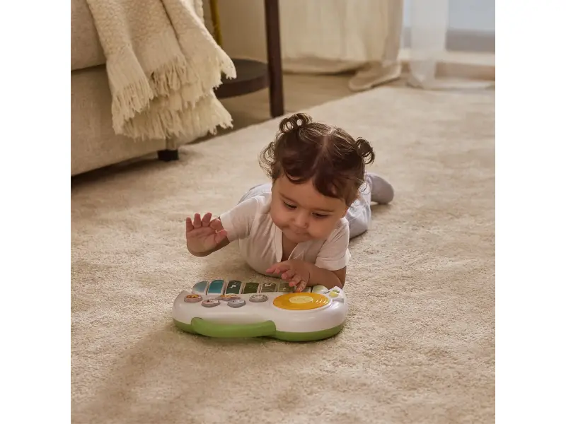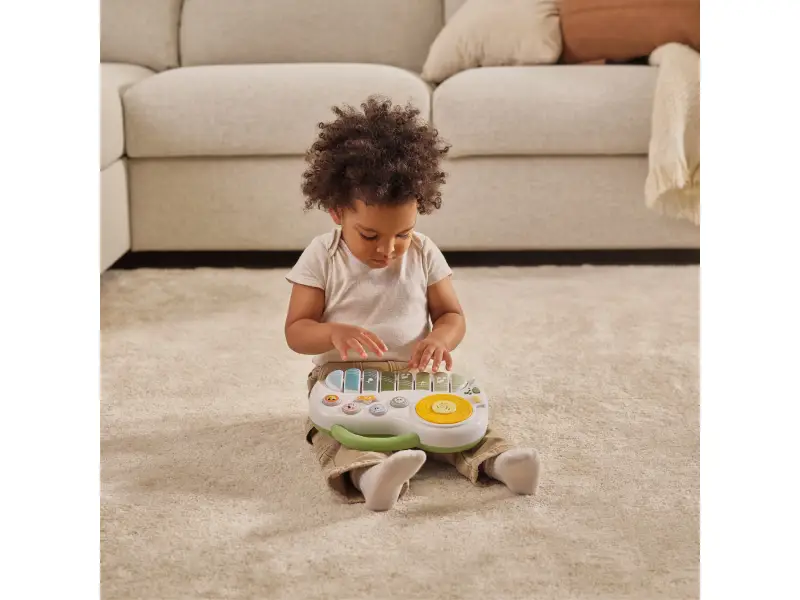 Hudobné piáno Tiny Love Farmers Funday deti zábavnou formou zoznamuje s hudbou, rytmom a zvukmi zvieratiek. Ponúka 4 režimy hry – od klasických tónov klavíra cez veselé melódie až po zvieracie zvukové efekty – a vďaka svetelným tlačidlám dokáže dieťa dlho udržať v pozornosti. Skvele sa hodí aj na hru na brušku: svetlá a zvuky motivujú dieťa zostávať aktívne dlhšie, čo podporuje posilňovanie a prípravu na ďalšie motorické míľniky. Stlačenie klávesov a tlačidiel navyše pomáha pochopiť princíp príčina – následok, pretože dieťa vidí, že jeho akcia vyvolá svetlo alebo zvuk. Piánko je ideálne ako pre samostatné objavovanie, tak aj pre spoločnú hru s rodičmi.