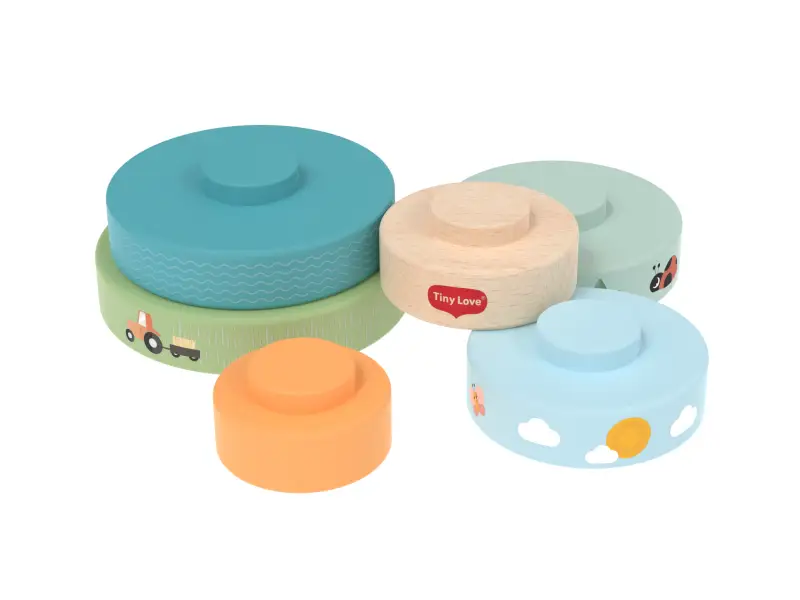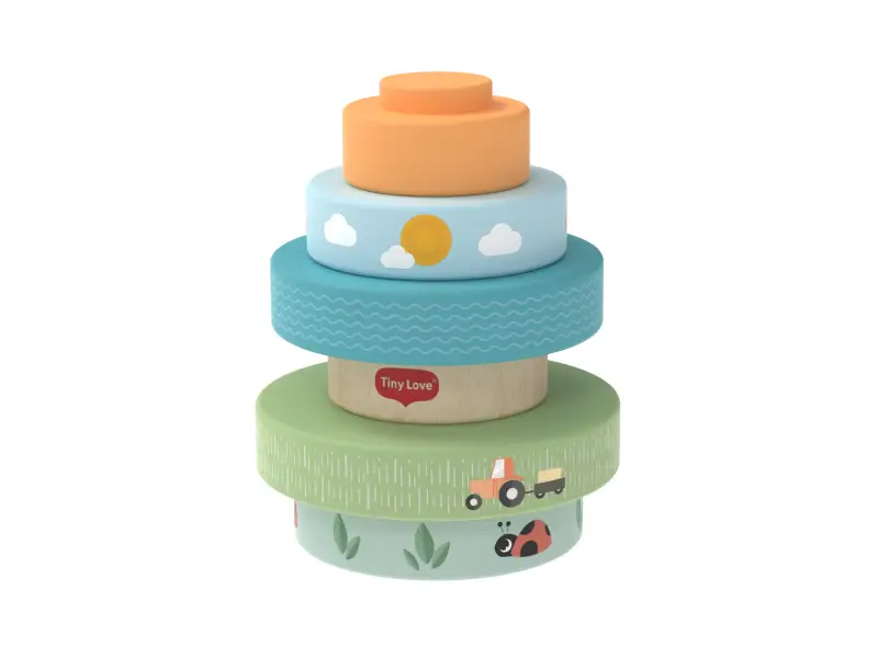 Drevené nasadzovacie krúžky Tiny Love ponúkajú rôzne možnosti hrania - deti ich môžu nasadzovať a stavať do veže, triediť podľa veľkosti, kotúľať s nimi a postupne objavovať a rozlišovať farby, veľkosti a jednoduché súvislosti. Krúžky s krásnou potlačou motívov zo života na farme sú ľahké a dobre sa držia aj malými detskými ručičkami.Hračka prirodzene rozvíja jemnú motoriku, koordináciu ruka-oko aj prvé logické myslenie.