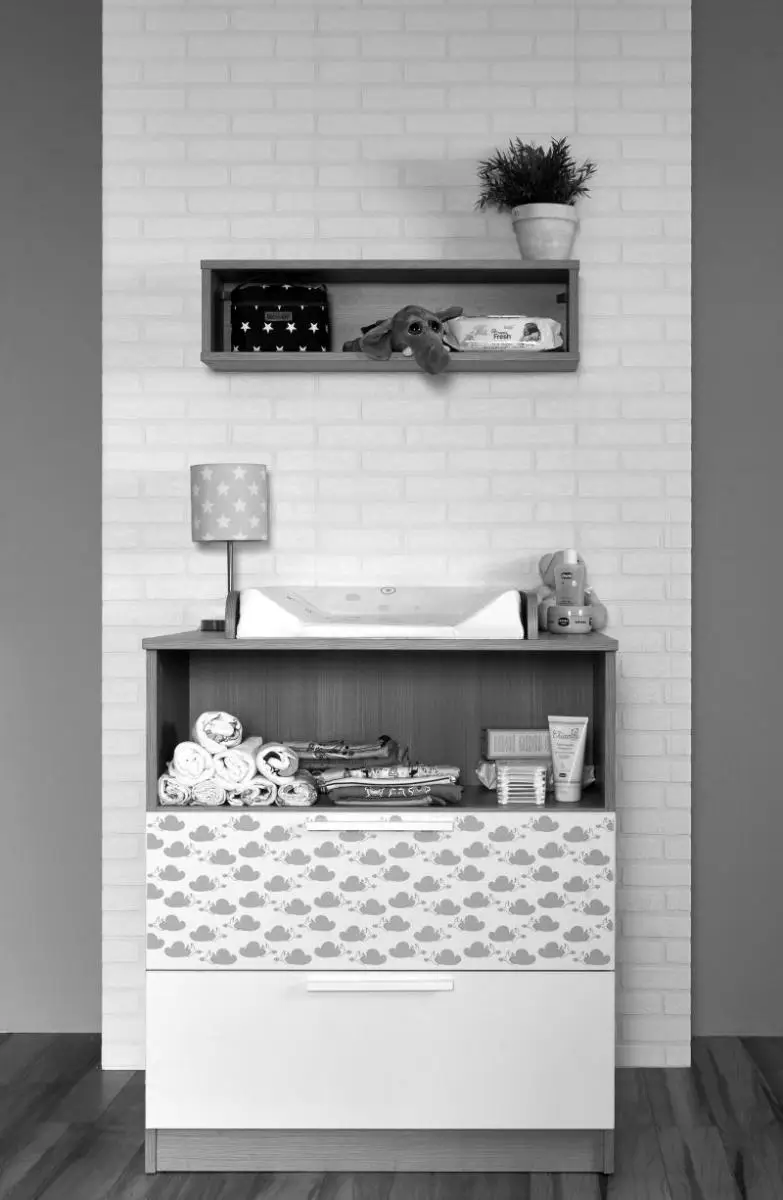 Komoda poskytuje dostatok priestoru na všetko potrebné, v hornej časti otvorená polička pre veľmi frekventované potreby, nižšia zásuvková časť chráni pred prachom. Komoda je optimálne vysoká na pohodlné prebaľovanie. V prípade využitia na prebaľovanie a ďalšiu starostlivosť o dieťa, je nevyhnutné dokúpiť prebaľovací nadstavec zväčšujúci hornú plochu komody a navyše vybavený bočnými bezpečnostnými zarážkami, ktoré zabraňujú posunutiu samostatne dokupovanej prebaľovacej podložky mimo komodu.