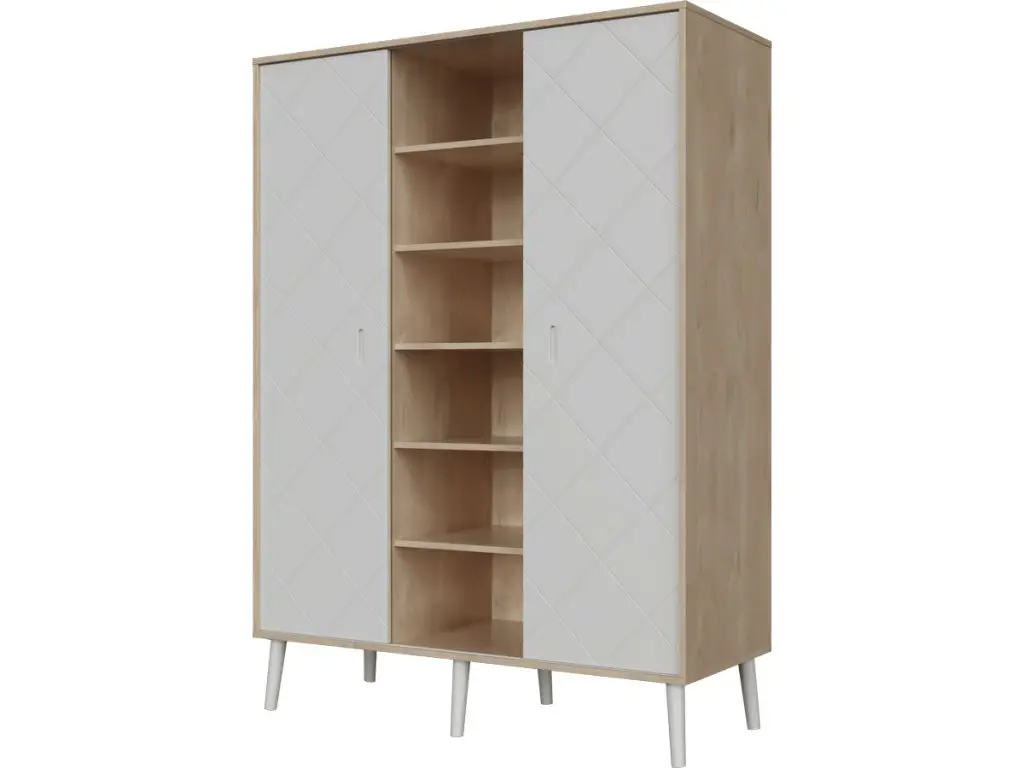Prevedenie: Skriňu je možné zostaviť v policovom alebo závesnom prevedení. Ľavá strana skrine obsahuje 1 policu a 2 šatníkové tyče, stredná otvorená časť obsahuje 5 poličiek, zatiaľ čo pravá strana skrine obsahuje 4 police.