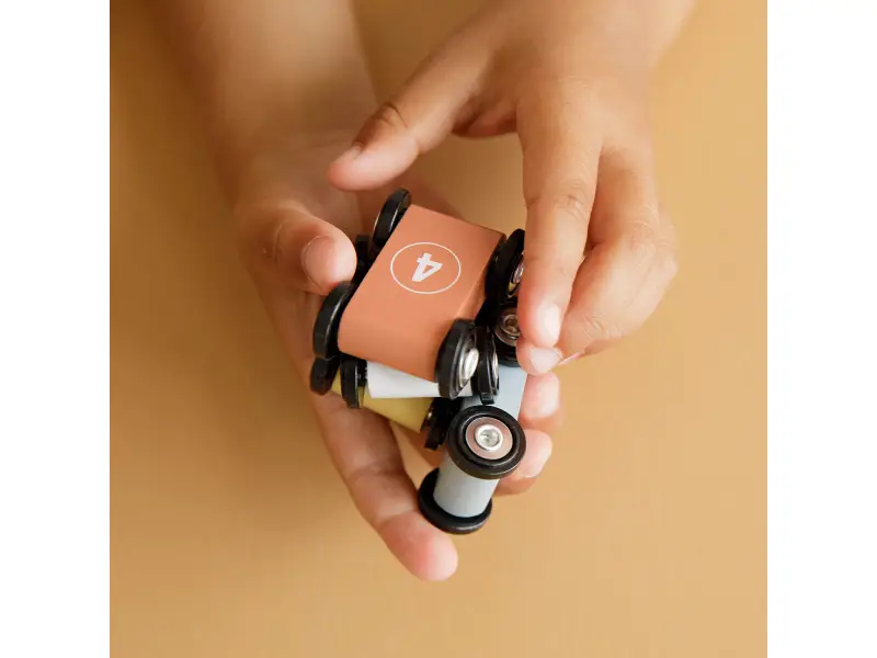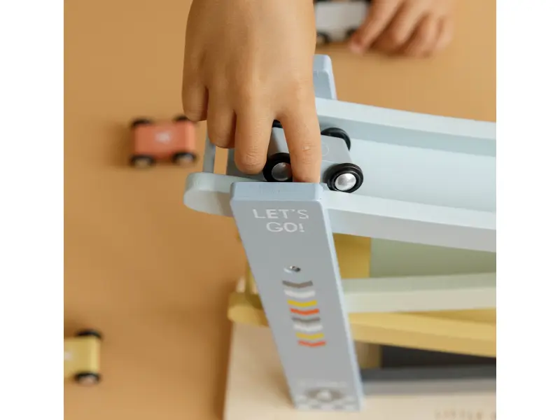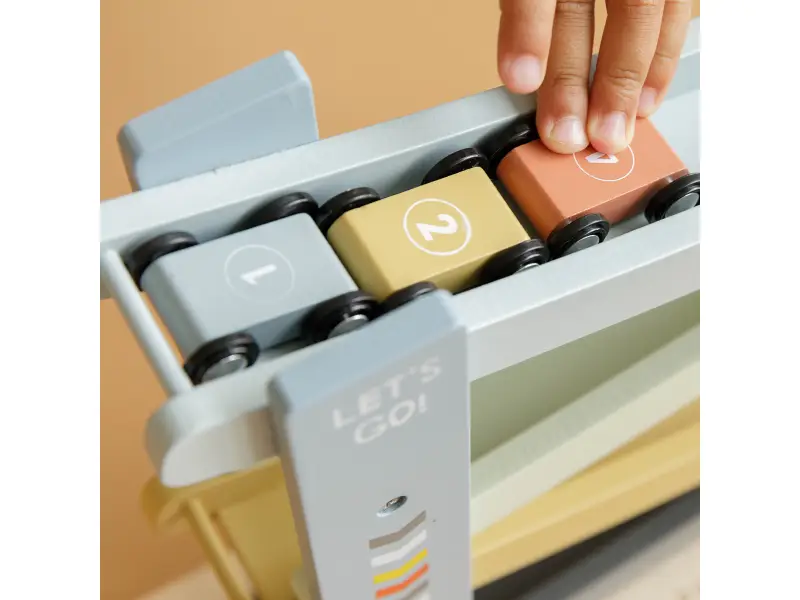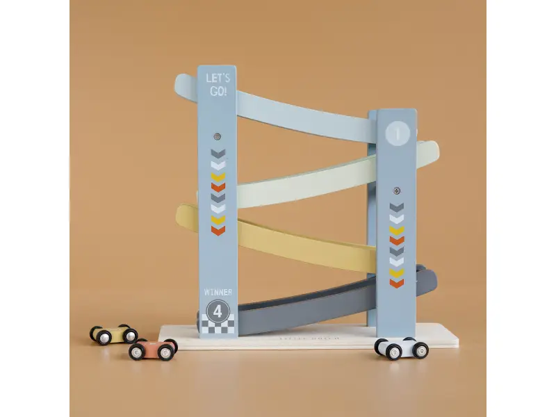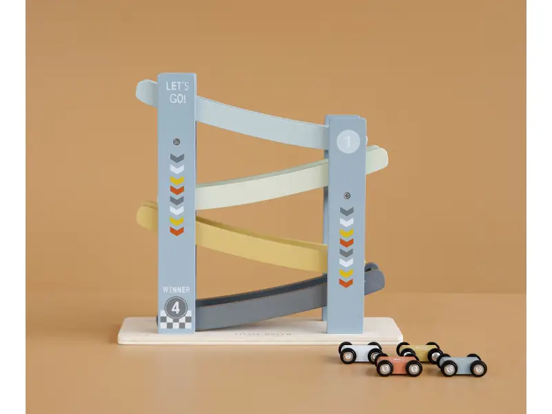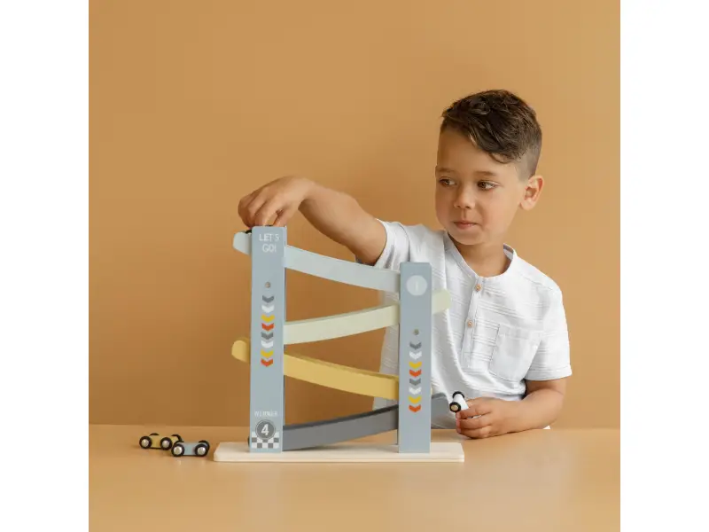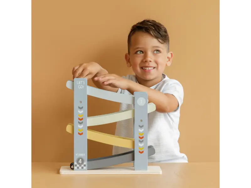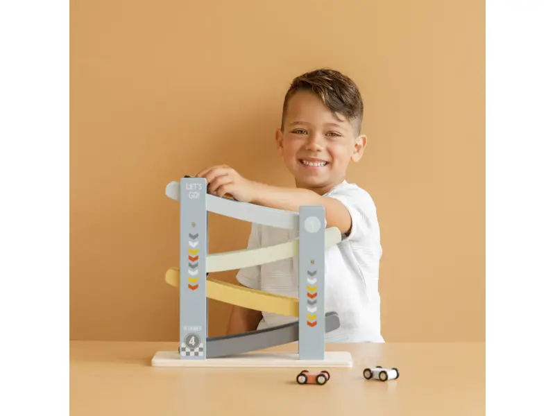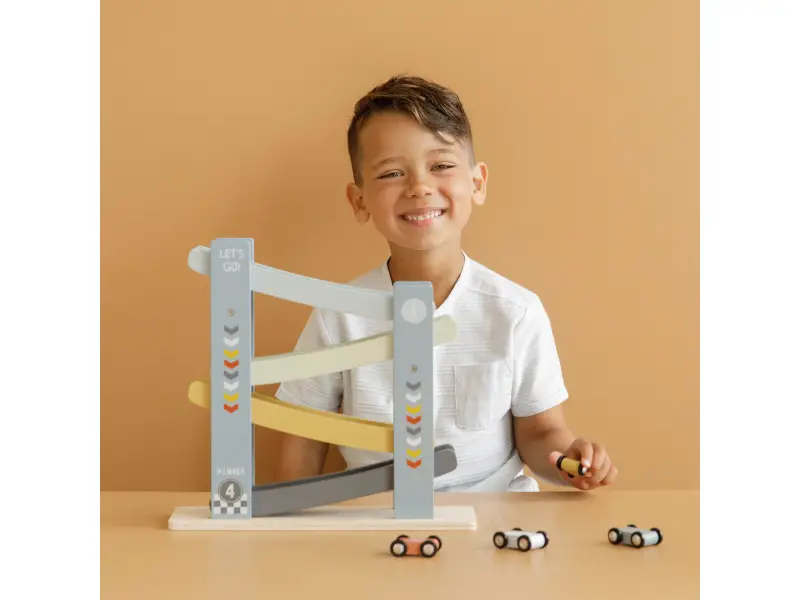 1, 2, 3, poďme pretekať! Vaše dieťa si zamiluje túto veselú drevenú dráhu so 4 autami. Postavte autá jeden po druhom na závodnú dráhu, uvoľnite ich a sledujte ako svištia dole. Deti to milujú!