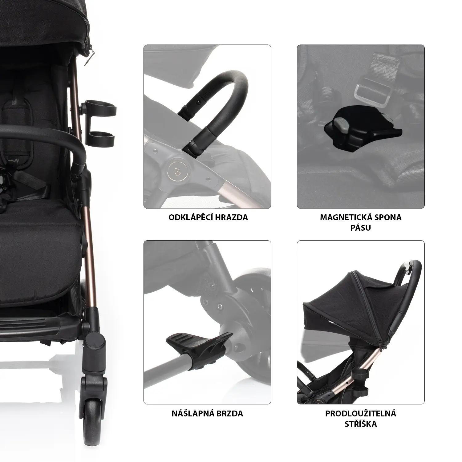 Mäkké športové sedadlo je vybavené 5-bodovým bezpečnostným pásom s magnetickou sponou. Hrazda kočíka sa dá sklopiť, aby sa dieťa ľahšie usadilo. Rozšíriteľná strieška s vetracím okienkom chráni dieťa pred slnkom a vetrom. Súčasťou balenia je aj košík, ktorý unesie až 3 kg predmetov potrebných na cestách.