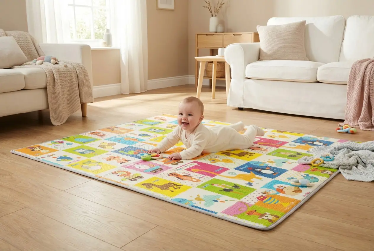 Mäkká, no zároveň dostatočne pevná pena chráni dieťa pred tvrdou podlahou a tlmí nárazy pri pádoch. Podložka vytvára ideálny priestor na lezenie, hranie aj oddych.