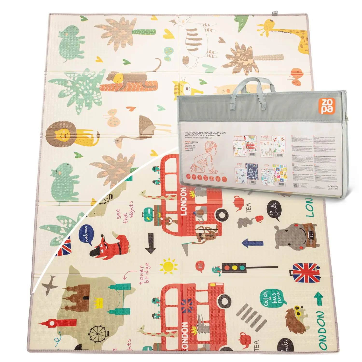 Vďaka obojstrannému prevedeniu môžete jednoducho meniť vzhľad podložky podľa nálady alebo interiéru. Veselé motívy podporujú fantáziu a rozvíjajú kreativitu dieťaťa.