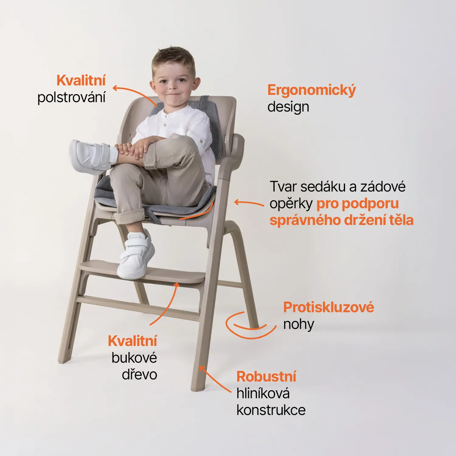 Akonáhle dieťa začne samostatne sedieť, jednoducho odstránite novorodenecký set a získate klasickú vysokú stoličku s praktickým odnímateľným pultíkom. Výškovo nastaviteľné sedadlo aj opierka nôh umožňujú ergonomické sedenie počas celého rastu.